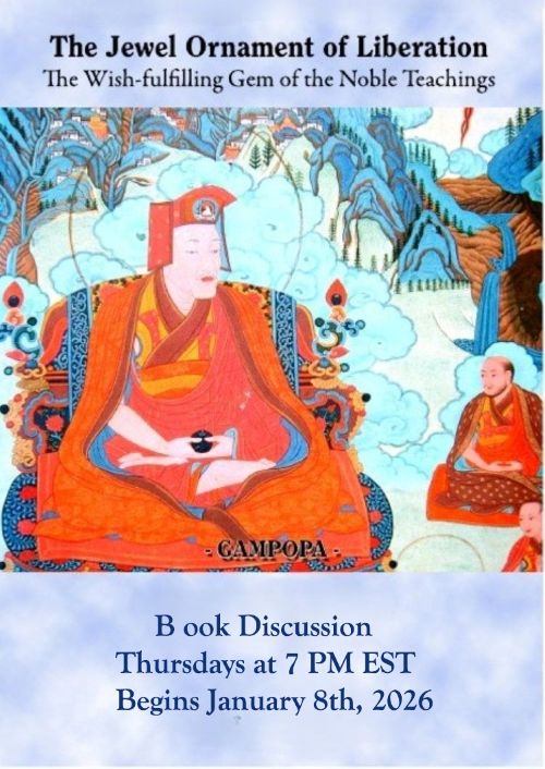 The Jewel Ornament of Liberation book discussion will be held every Thursday at 7 PM EST starting January 8, 2026. Topics will include: